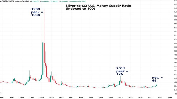 The chart, indexed to 100, shows that this ratio was 1,377 at the 1980 peak, 87 at the 2011 peak, and only 33 today. This indicates that silver has substantial room to catch up to the expanding national debt. In that context, $50 silver is not expensive by any measure, and a move to $100 or more is far from inconceivable.
