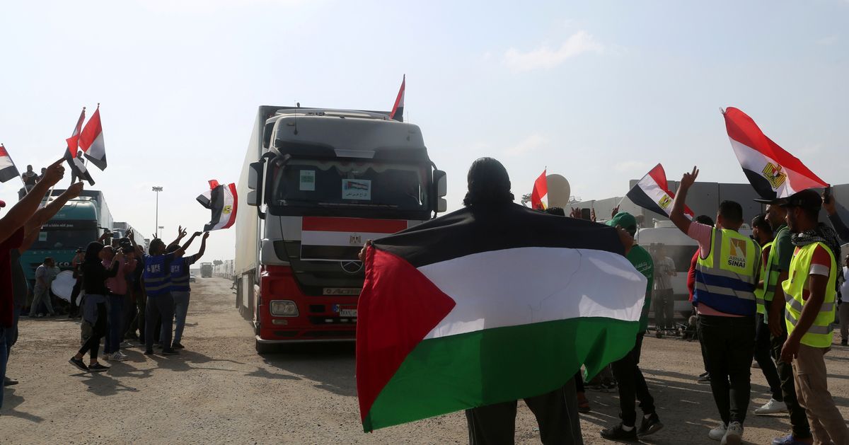 On Saturday, 20 trucks entered Gaza in the first aid shipment into the territory since Israel imposed a complete siege at the start of the war. Israel allowed a second convoy of 15 trucks into Gaza on Sunday. Both entered from Egypt through the Rafah crossing, the only way into Gaza not controlled by Israel.
