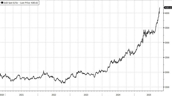 Gold, which traded below $2,000 just two years ago, has outpaced gains in equities so far this year, this decade, and this century, reflecting investor demand for safe-haven assets amid inflation concerns and geopolitical unrest, after ignoring precisely the same arguments presented by “tinfoil hat” conspiracy blows such as this one. It continued its torrid advance on Tuesday, climbing to a record $4,184 an ounce, extending its gain this year to almost 60%.