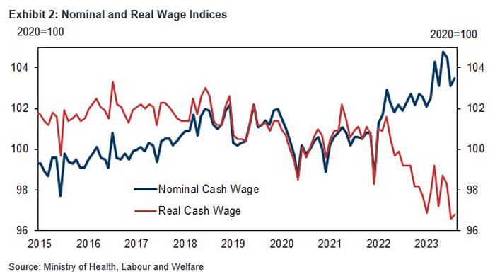 Meanwhile, continued yen weakness means one thing: inflation will keep rising and rising as real wages keep falling and falling… and just hit a record low.