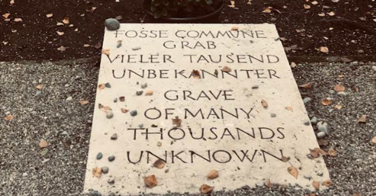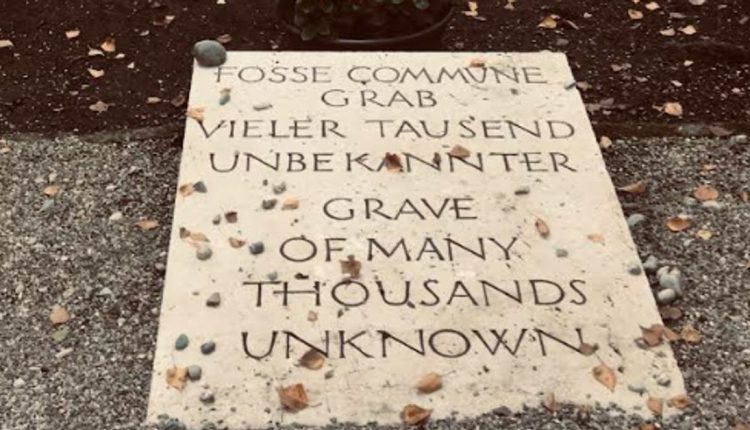A stone marker in a path that leads through a grove reads “grave of many thousands unknown.” Another engraved stone identifies the path as an execution site where Nazi guards shot 92 Soviet officers in 1944.