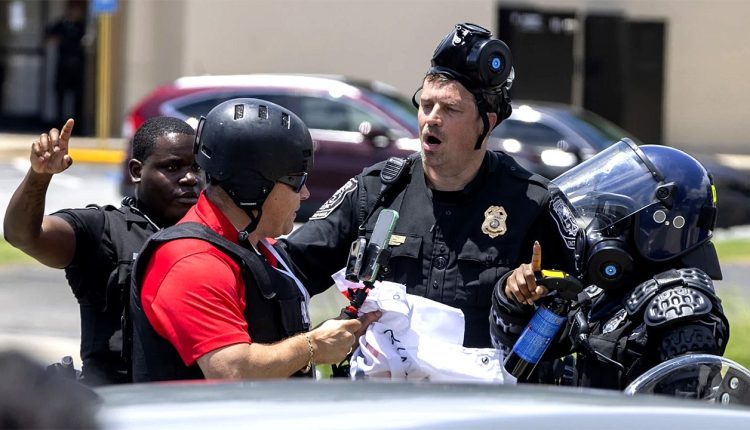 In video captured by Guevara, the Spanish-speaking journalist is seen wearing a helmet, red shirt and a vest that read “PRESS.” Guevara captured video clips of riot police moving in formation, while he also described the scene in Spanish.