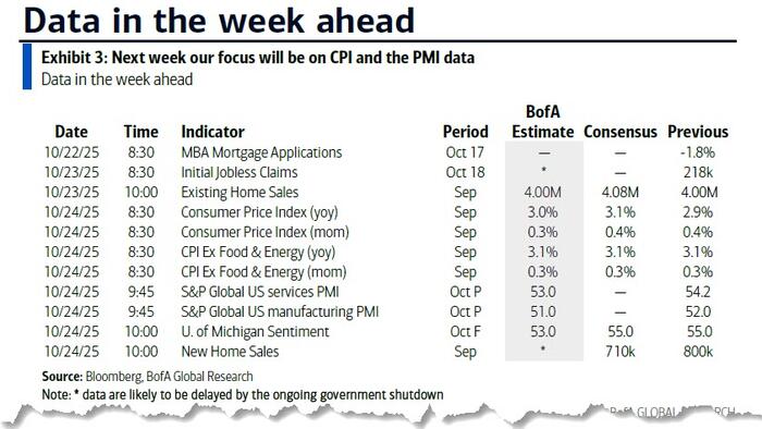 Looking at just the US, Goldman writes that the September CPI report—originally scheduled for release last week—will be released on Friday. The new home sales report on Thursday will be postponed if the federal government shutdown continues until then. The Department of Labor will also postpone the official release of the jobless claims report if the government shutdown continues through Thursday, but preliminary state-level claims data will likely be available. There are no speaking engagements by Fed officials this week, reflecting the FOMC’s blackout period.