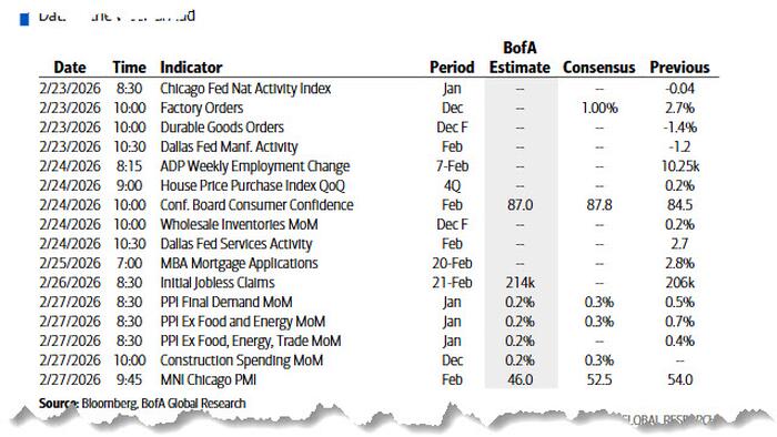 While much digital ink has been spilled on the Supreme Court’s striking down of Trump’s IEEPA tariffs and the consequences of this decision (see “Full Analysis Of The Supreme Court IEEPA Decision: How It Impacts The Economy, Policy And Markets“), a lot more is on deck for this week when we will also have more geopolitical headlines to contend with, as the latest round of US-Iran talks is expected in Geneva on Thursday. The talks come amid a recent buildup of US forces in the region and yesterday the New York Times was the latest outlet to report that Trump is considering an initial targeted strike against Iran in the coming days, which could be followed by a larger attack if Iran does not give in to US nuclear demands. Other highlights for the week ahead include the State of the Union address in the US (late tomorrow), US PPI and preliminary CPIs in Europe (both Friday). In earnings, the focus will be on Nvidia, Salesforce (both Wednesday) and Home Depot (tomorrow). Nvidia’s earnings could be the most important of these but expect lots of headlines from the State of the Union speech.