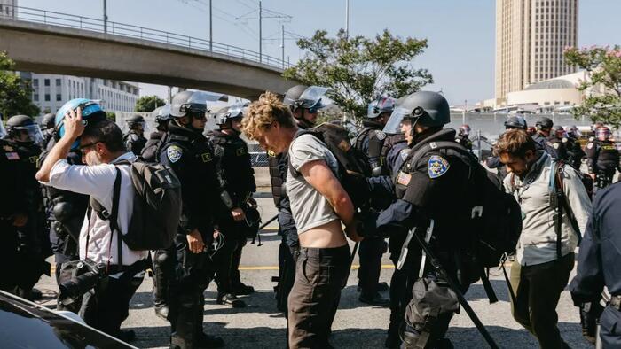 California Highway Patrol officers arrest an unidentified demonstrator during protests in Los Angeles on June 10, 2025. David Pashaee/Middle East Images/AFP via Getty Images