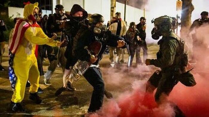 Agitators in Portland could be heard yelling explicit comments and death threats towards federal agents. “The guillotine would be ready for them,” one wearing black-bloc clothing shouted. Some yelled “ICE out of Portland,” while a crowd of pro-ICE supporters were also seen over the weekend—with one holding a sign that read “God Bless ICE.”