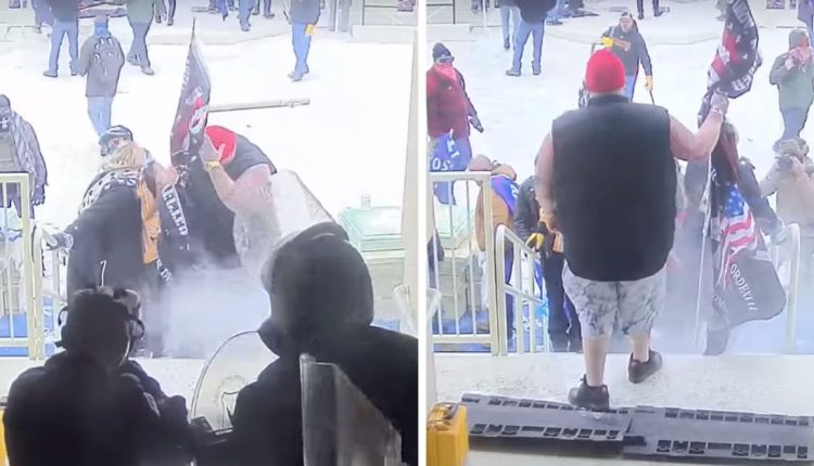 Once inside the walkway, he grabbed police riot shields and repeatedly pushed against officers while forcing his way into the building through a smashed glass door, authorities said