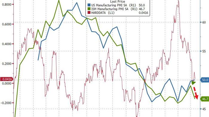 Sure enough, S&P Global’s US Manufacturing PMI printed 50.0 final for October (in line with the flash print and expectations and up slightly from September’s 49.8). But, ISM’s Manufacturing survey printed well below expectations (46.7 vs 49.0 exp vs 49.0 exp)…