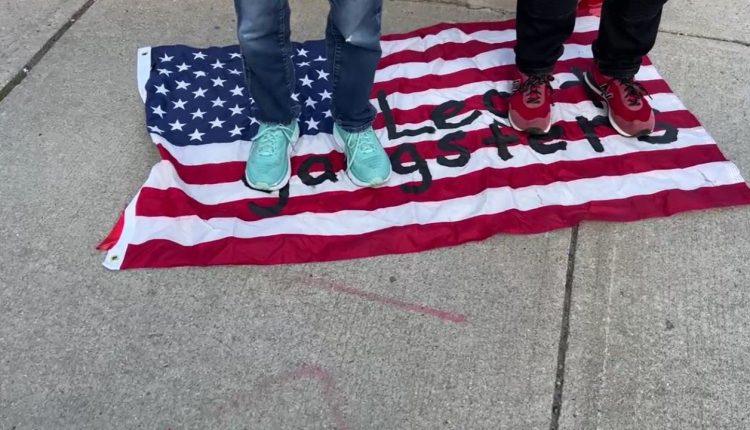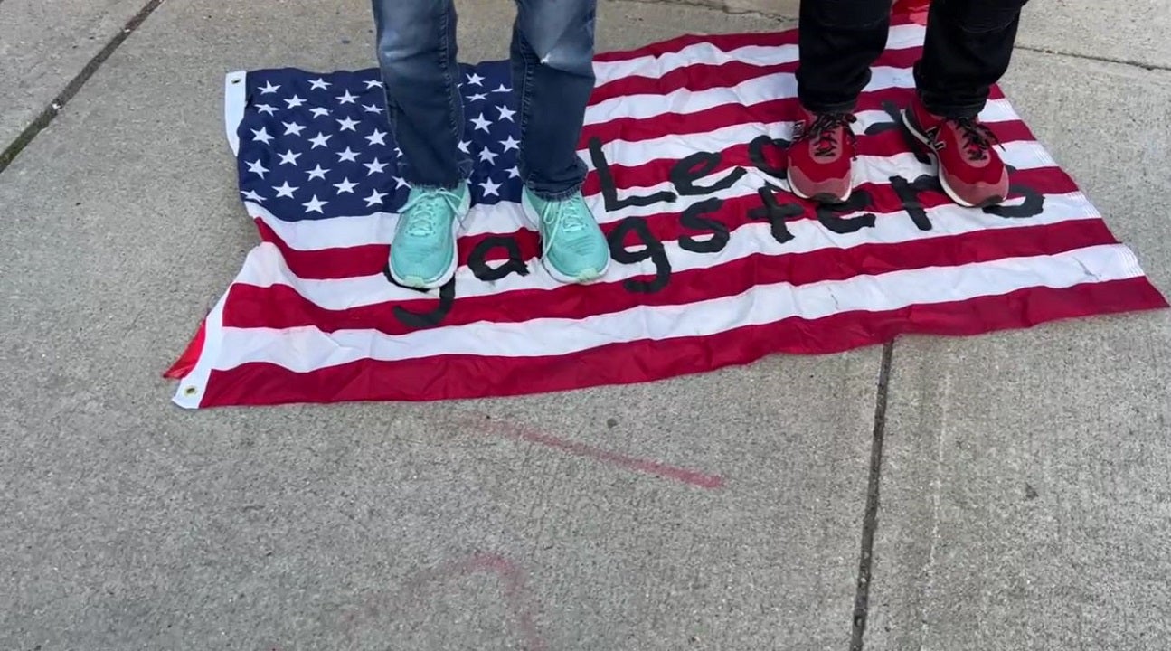 Anti-Israel demonstrators in Massachusetts called the United States “Legit Gangsters” Monday and stood on the American flag while voicing support for Palestinians.