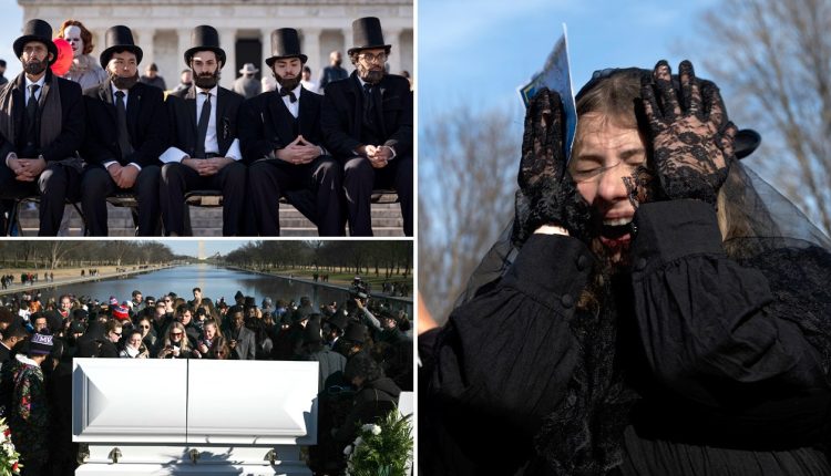 Actors portraying Presidents George Washington and Thomas Jefferson were among the mourners, along with a portrayal of John Wilkes Booth, Abraham Lincoln’s assassin, FOX 10 reported.