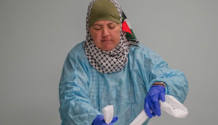 Khalil’s voice, confident and clear, reverberates in the room as she explains the rituals of how to wash and wrap a body according to the Islamic tradition. She wears blue medical gloves and a medical apron over her long black abaya, a loose garment worn by Muslim women, that she paired with a keffiyeh-print hijab. Behind her are the Palestinian and American flags, representing the large Palestinian American community in the town.