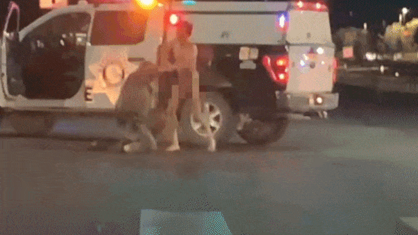 Video footage captured an aggressive nude man slipping out of a Las Vegas cop’s grasp and making off in his police cruiser on Tuesday.