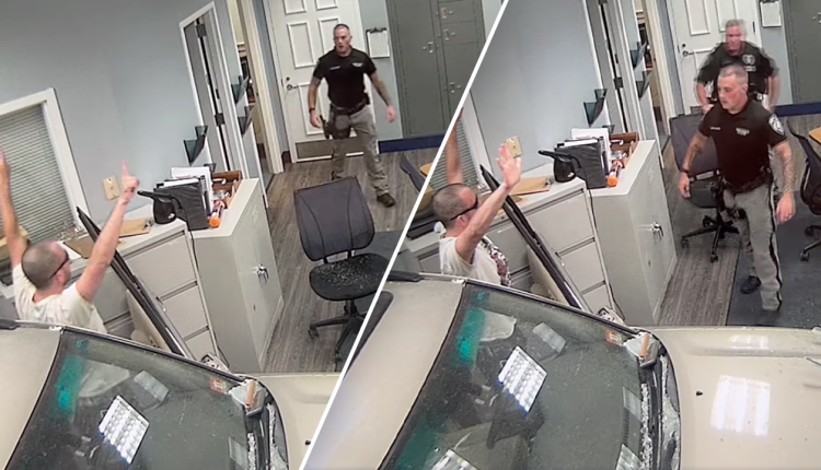 The suspect is seen hopping out of the vehicle quickly after the crash and immediately raising his hands as two officers enter the room. The officers appear shocked by the crash but immediately grabbed Hargreaves for a pat-down and took him into custody.