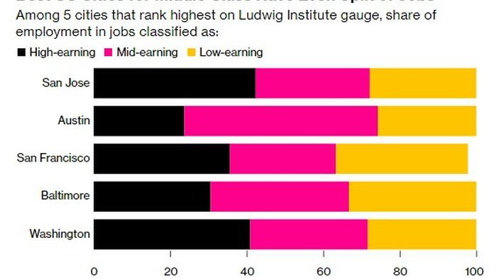 For instance, Las Vegas and Miami have 63% and 56% of workers in low-wage roles, respectively, compared to the national average of around 35%. Better-performing cities in Ludwig’s ranking, such as Austin and Baltimore, have even lower percentages of low-wage jobs.