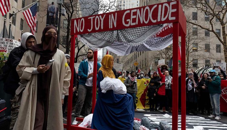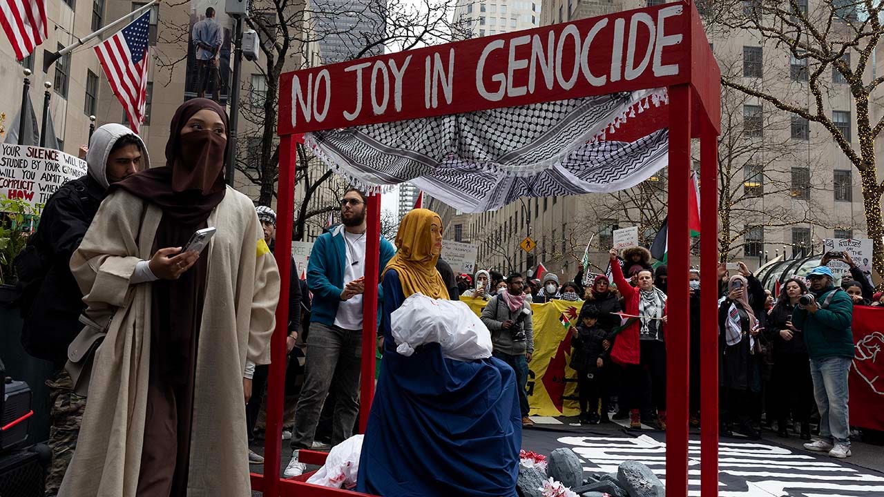 One of the signs being carried by a protester read, “While Ur Shopping Bombs are Dropping,” the New York Post reported. Another read, “No Joy in Genocide,” which was splattered on top of a faux Nativity scene splattered with what appeared to be fake blood and carried on the shoulders of demonstrators.
