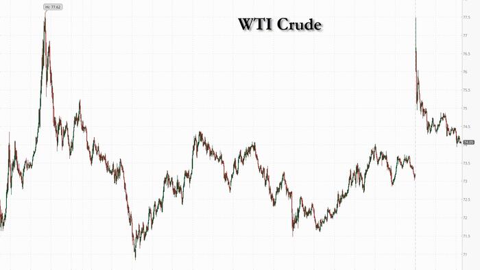 Brent crude rose as much as 5.5% to $77.50 – its Thursday night high – in early Asian trading after Israel and Iran continued attacks on one another’s territories over the weekend. The price then promptly ease back as shorts who stand to suffer massive losses in case of a squeeze, doubled down by shorting even more in hopes the crises somehow de-escalates.