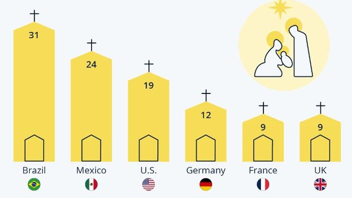 As Statista’s Anna Fleck notes, of the six countries included in the survey, Brazil had the highest share of people saying they intended to go to a Christmas mass this year: around one in three respondents (31 percent).