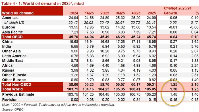 OPEC has revised its global oil demand growth forecast for 2025, citing escalating trade tensions and weaker-than-expected economic indicators, according to Reuters and OilPrice.com. The cartel now anticipates a demand increase of 1.3 million barrels per day (bpd) for 2025, down 150,000 bpd from its previous projection. Similarly, the 2026 forecast has been adjusted downward to 1.28 million bpd.