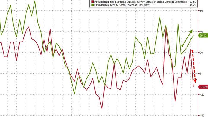 However, while the headline sentiment index tumbled, the survey’s future indicators suggest “widespread expectations for growth over the next six months” according to the Philly Fed…