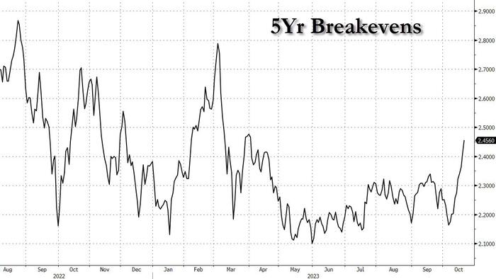 Five-year breakeven rate, a gauge of investors’ inflation expectations derived from the difference between the nominal Treasury and TIPS yields, rose to a seven-month high of 2.46% Friday. In March, the gauge jumped to about 2.8%