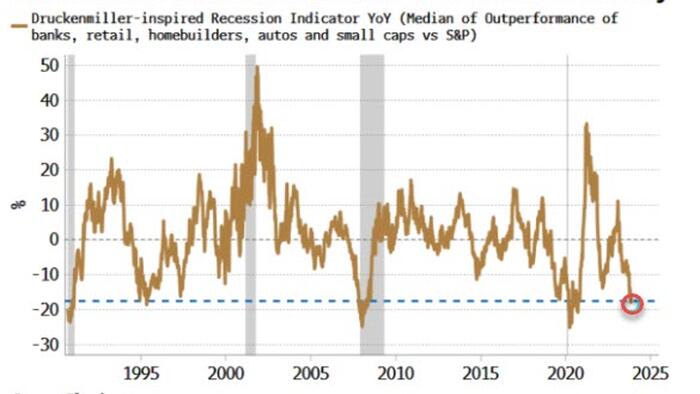 Still, it underpinned a burgeoning recession narrative in markets. Most stark has been the underperformance of some of the most cyclical sectors. An indicator based on the methodology of Stanley Druckenmiller — who has said “the inside” of the stock market is the best economist he knows — is at levels that have previously coincided with a recession.
