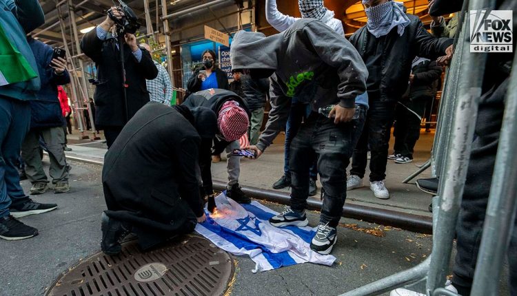 Pro-Palestinian protesters light Israel flag on fire in New York City, trample flyers for Hamas terror victims