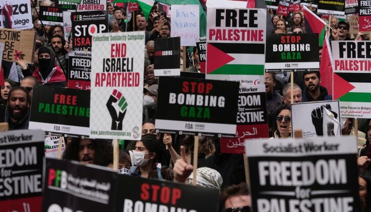 In London, demonstrators holding Palestinian flags and signs demanding a cease-fire took over the Golden Jubilee Bridge on Saturday near the British Parliament complex.