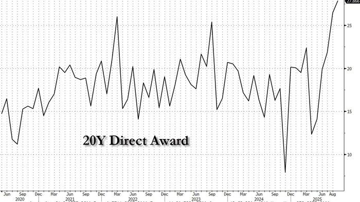 After 3 stellar coupon auctions last week, with 10Y yields trading effectively at the lowest level since last October (excluding the Liberation Day basis trade freak out) , and with the Fed set to cut by at least 25bps, there was little anxiety ahead of today’s 20Y coupon auction. And with good reason: moments ago the day’s coupon auction, a reopening of the 19-Year, 11-Month cusip UN6, went without a glitch in what was a very solid auction.