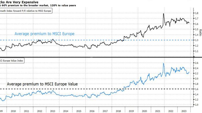 However, growth equities come at a cost, especially as their earnings profile has underwhelmed in recent years, relative to value. That’s left the group trading at hugely expensive valuations, with a premium of more than 60% to the overall market. And compared to value, growth is twice as pricey.