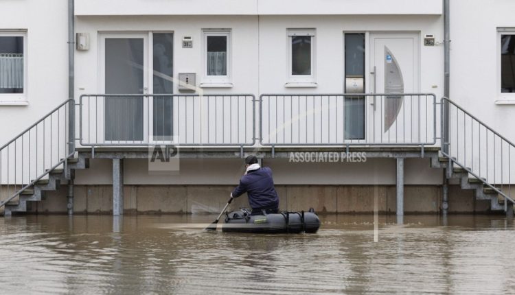 In the western German city of Oberhausen, firefighters and officials from the Federal Agency for Technical Relief worked to fortify a dike on the river Ruhr with sandbags to prevent flooding caused by the elevated water levels.