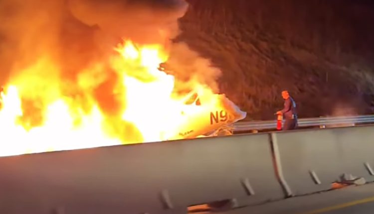 A motorist who witnessed the aftermath of the crash shared video footage with NBC News showing the plane on fire, with large plumes of smoke reaching into the sky. As the driver passes the blaze on the opposite side of the freeway an explosion can clearly be heard.