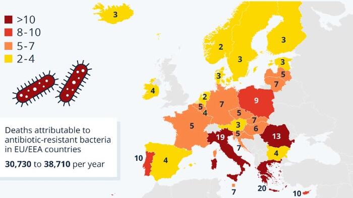 According to the latest study on antibiotic resistance mortality by the European Centre for Disease Prevention and Control, antibiotic-resistant bacteria caused the deaths of around 31,000 to 39,000 people each year across 29 European countries between 2016 and 2020.