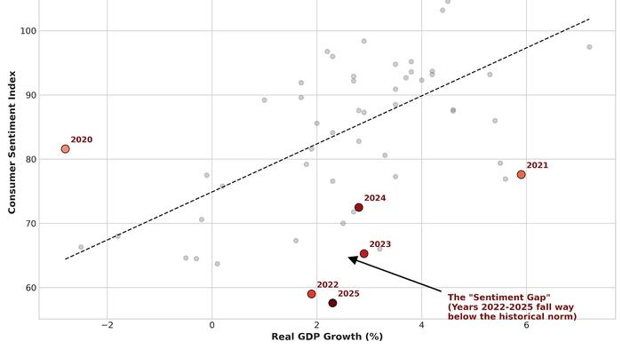 If you look not at whether sentiment is correlated with growth, but at absolute levels, the situation is even more clear. Growth has been pretty good from 2021-2025, but the public is really mad.