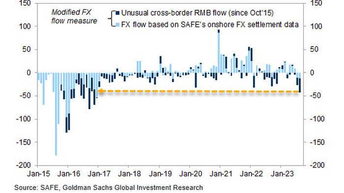 1. In August, China experienced $24bn in net outflows via onshore outright spot transactions, and $12bn inflows via freshly entered and canceled forward transactions. Another SAFE dataset on “cross-border RMB flows” showed outflows of $31bn in the month, suggesting net payment of RMB from onshore to offshore. Goldman’s preferred FX flow measure therefore suggests a total US$42bn outflows in August, in comparison with US$26bn outflows in July, an outflow which was the highest since July 2022.