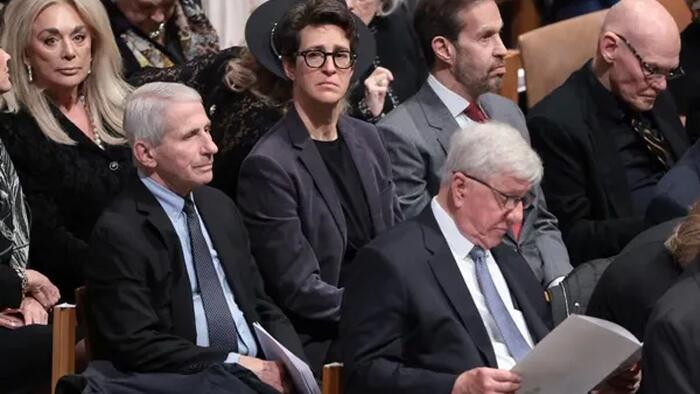 Joe Biden was there, perky as all get-out for somebody with stage-four prostate cancer, shaking hands with Mike Pence, who pulled him over the finish line in 2021. John Brennan, coupster superbus was there. Ditto John Bolton (awaiting trial). Most cheekily of all, Dr. Fauci, the father of Covid-19 and its little helper, the Covid vaxx, was seated next to MSNBC’s loss-leader, Rachel Maddow, who famously declared in 2021, “The virus stops with every vaccinated person!” (Not.)