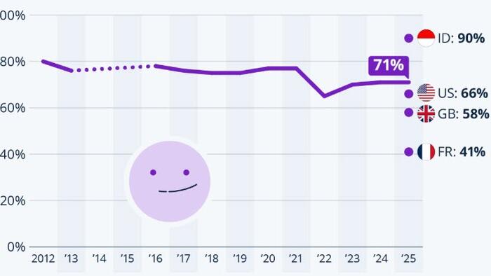 For instance, when looking at national breakdown, Indonesia has a high share of people feeling positive about their coming year. Out of the 30 countries polled, it comes out on top, with 90 percent of respondents feeling more optimistic about 2026. This is the same as last year.