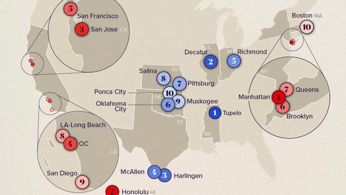At the other end of the spectrum, living costs in Manhattan are more than twice the national average—72% higher than even San Francisco. Neighboring boroughs like Brooklyn and Queens also rank among the least affordable in the U.S., driven by an influx of Manhattan buyers during the pandemic.