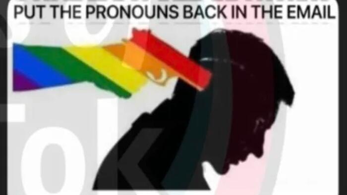 The image, posted on X by Libs of TikTok, depicts an arm holding a pistol (both colored as a rainbow) held at the back of a man’s head, with the “pronoun” demand written directly above.