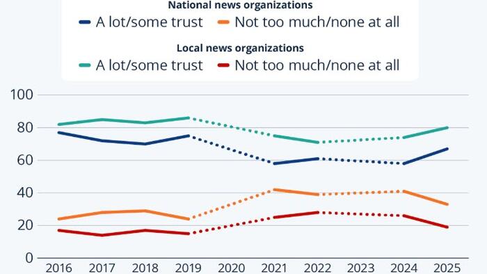 Local news organizations continued to encourage higher levels of trust and confidence across the board, with 80 percent of all adults stating they trust such outlets in 2025, up six percentage points from 2024. Democratic Party leaning voters had higher levels of trust in local news organizations than Republicans at 87 percent versus 75 percent. Here the gap between the two groups was 12 percentage points, compared to the wider trust gap for national news outlets of 28 percentage points.