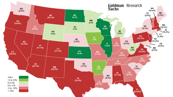 A team of Goldman analysts, led by Susan Maklari, penned a note on Tuesday that provides a heat map for the nation’s housing market, showing that falling housing permits signal the real estate market shifted into a lower gear. Builders are more cautious in late year, buyers are waiting for the Fed Chair Powell to unleash another round of interest rate cuts, and home price growth has stalled. The Midwest is holding up, but the South and West markets are softening the fastest.
