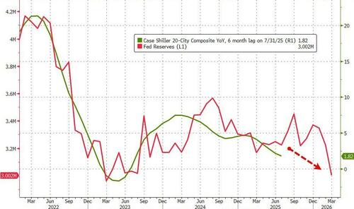 As we highlighted in our report, home price changes tend to track closely with bank reserves at the Fed on a six-month lag, and this only implies prices could decelerate in the new year following a brief rebound.