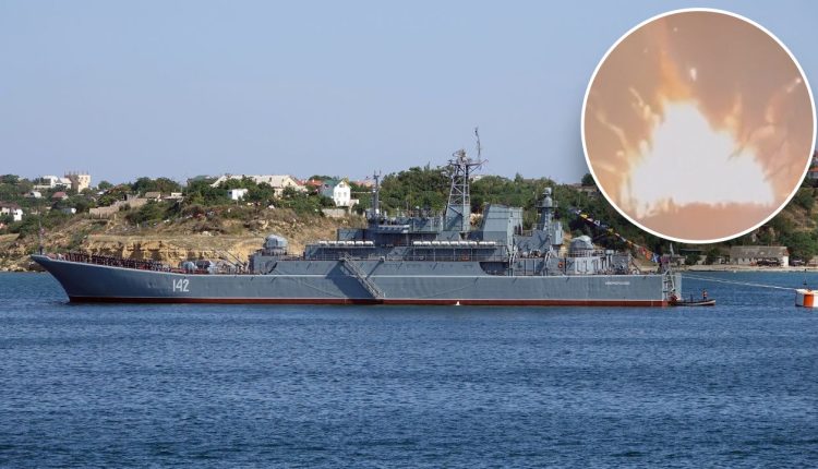 The landing ship, called Novocherkassk, was hit at a base in the city of Feodosia by plane-launched guided missiles, the ministry said, and footage posted online shows a huge fireball rising into the night sky as a result of the attack. Further explosions detonating could also be seen as well as fires burning.