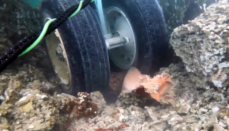 The underwater footage shows the “two points of contact the aircraft has with the coral and the remainder of the aircraft floating above,” the Navy said. The video shows tires on the coral as tiny fish swim through rock crevices.
