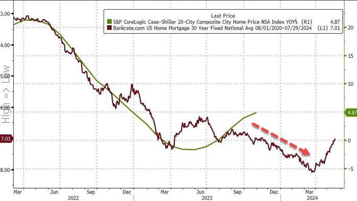 But, judging by the resumption of the rise of mortgage rates since the Case-Shiller data was created, we would expect prices to also resume their decline…
