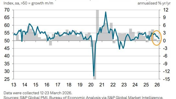 With ‘hard’ US macro data having drifted weaker all year, consensus was expecting only a modest decline in S&P Global’s US Composite index in preliminary March data (that presumably will be affected in some part by the war and its consequences).