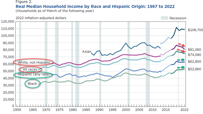 But wait, there’s more, because like everything else under the Biden administration’s favorite trope of divisive identity politics, race had a huge impact on the latest household income numbers too. See if you can spot it from the chart below.