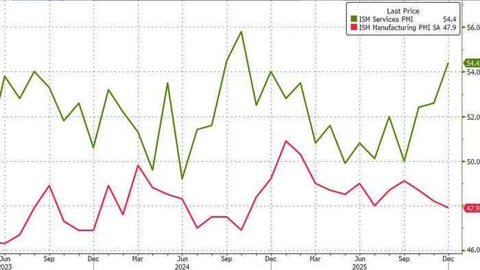 The Institute for Supply Management’s index of services rose 1.8 points to 54.4, the highest since October 2024 (recall readings above 50 indicate expansion in the largest part of the economy). The December figure exceeded all projections in a Bloomberg survey of economists. Ironically, it printed at the exact same time as the latest JOLTs report which as we noted earlier, printed below all Wall Street estimates.