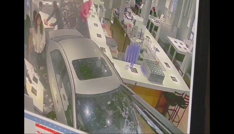 The video shows a four-door sedan backing into the restaurant at a high rate of speed, slamming through the glass and then hitting a booth where people were sitting.