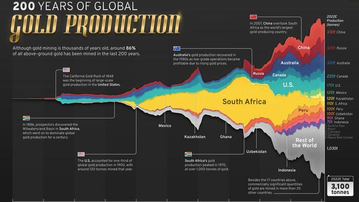 Visualizing 200 Years Of Gold Production, By Country
