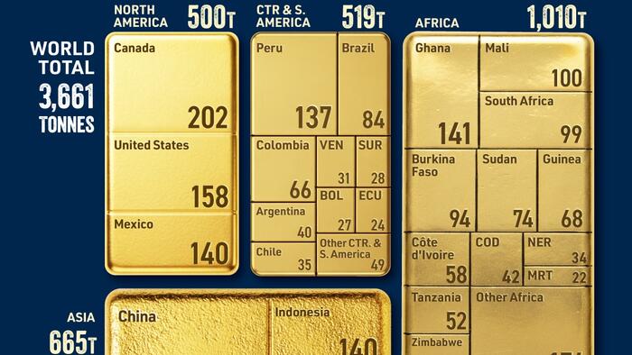 Africa is the world’s top gold-producing region, generating 1,010 tonnes in 2023. Ghana leads the continent with 141 tonnes, followed by Mali (100 tonnes) and South Africa (99 tonnes).